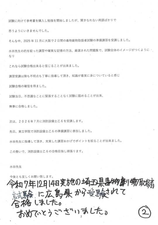 令和7年度埼玉県毒物劇物取扱者試験に合格されたからのお便り(2)