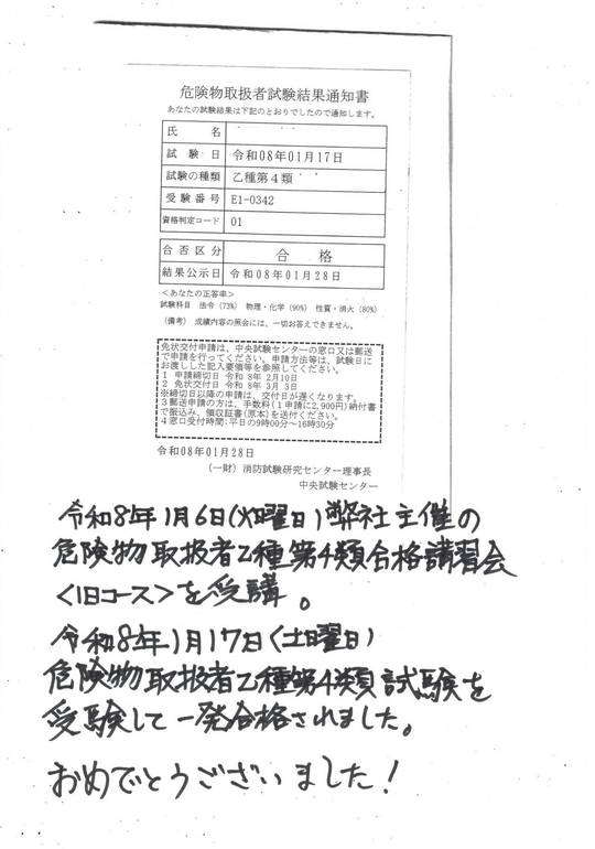 まったくゼロからの勉強でスタート、初受験で一発合格。令和8年1月17日危険物取扱者乙種第4類試験に合格した方から頂いた合格通知書です。