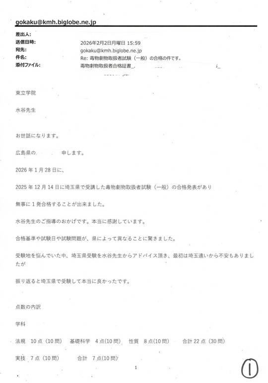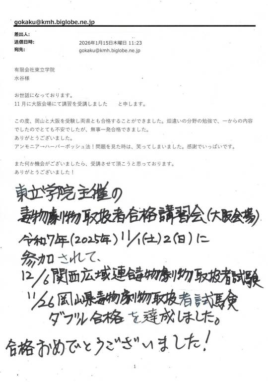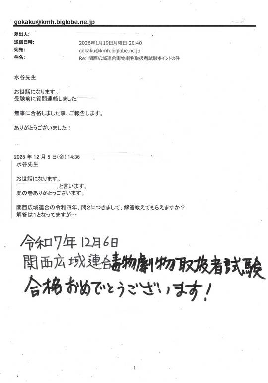 2025年12月6日関西広域連合毒物劇物取扱者試験に合格された方からのお便り(1)