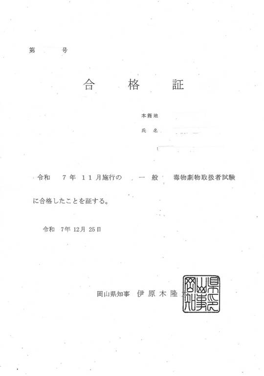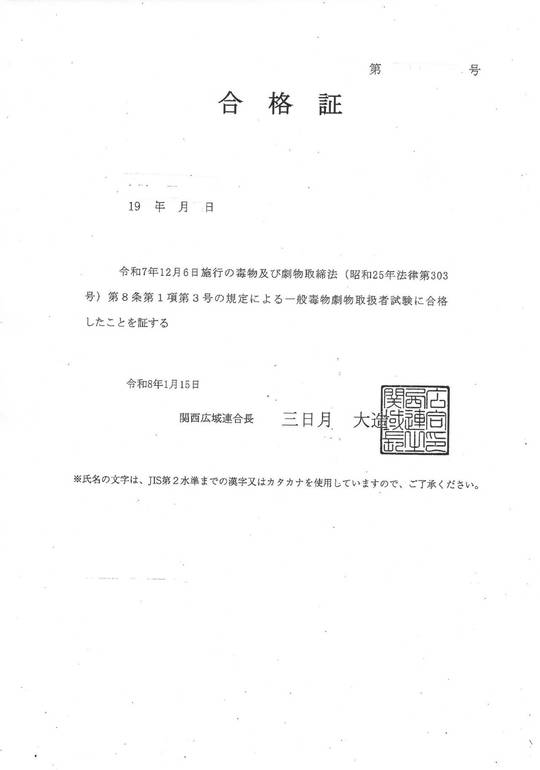 令和7年度実施関西広域連合毒物劇物取扱者試験合格証