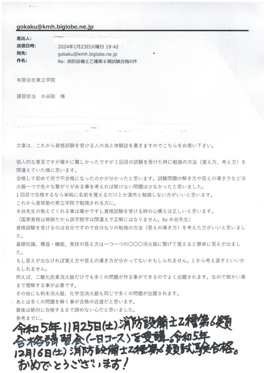 受講者様より送られたお便り(消防設備士乙種第6類)(1)令和5年3月