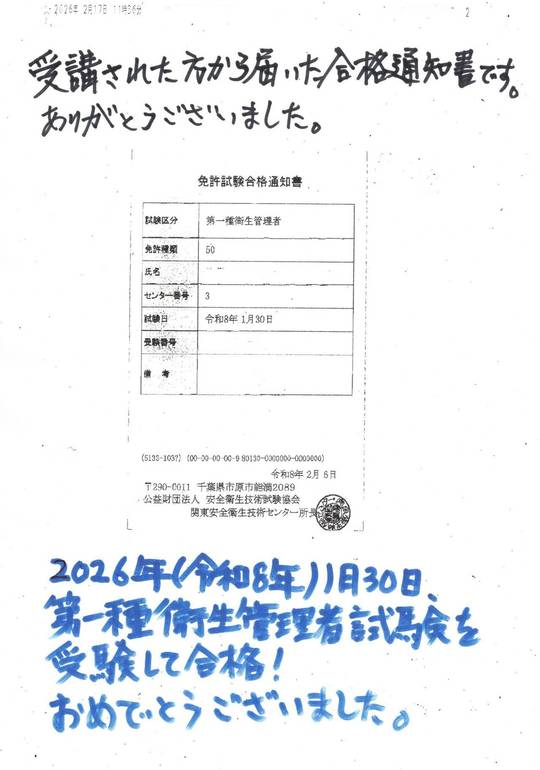 第一種衛生管理者合格通知書(令和8年1月30日試験)