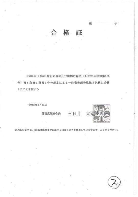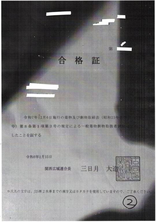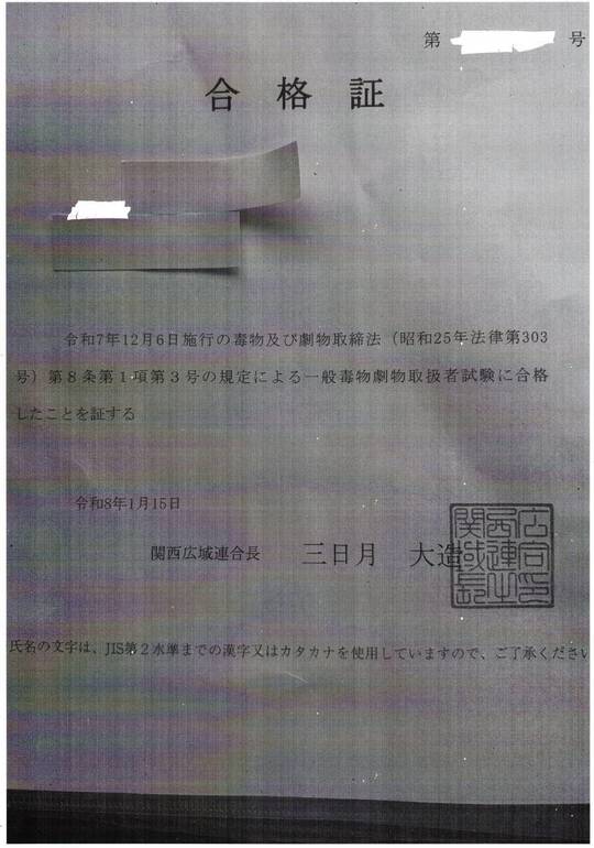 2026年(令和7年度)関西広域連合毒物劇物取扱者合格証