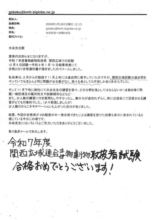 令和7年12月6日関西広域連合毒物劇物取扱者試験合格された方のお便り(1)