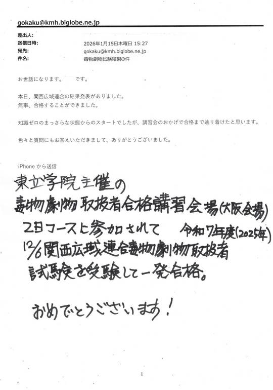 2025年(令和7年)関西広域連合毒物劇物取扱者試験に合格されたからのお便り