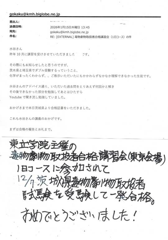 令和7年12月7日茨城県毒物劇物取扱者試験に合格された方から頂いたお便り