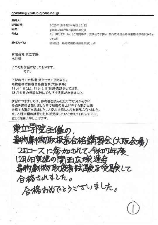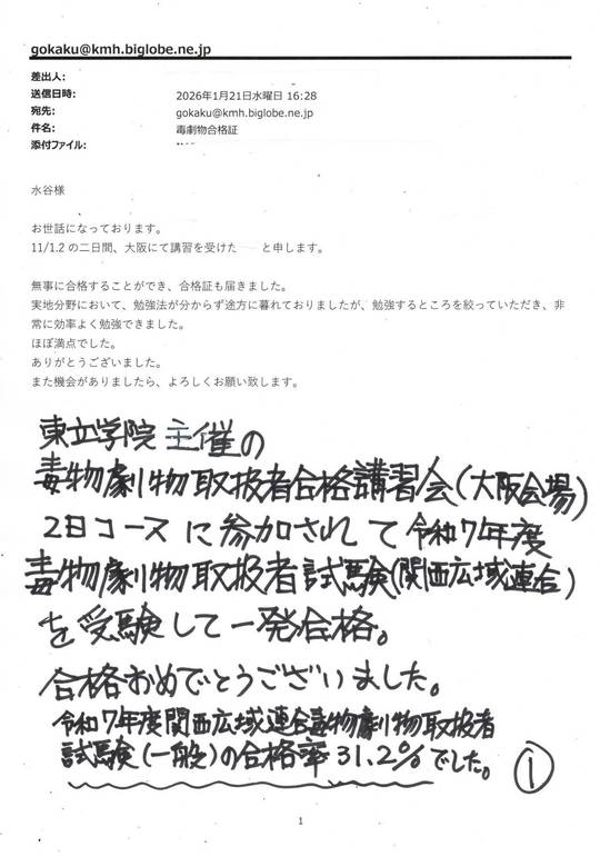 令和7年12月6日関西広域連合毒物劇物取扱者試験に合格された方からのお便り